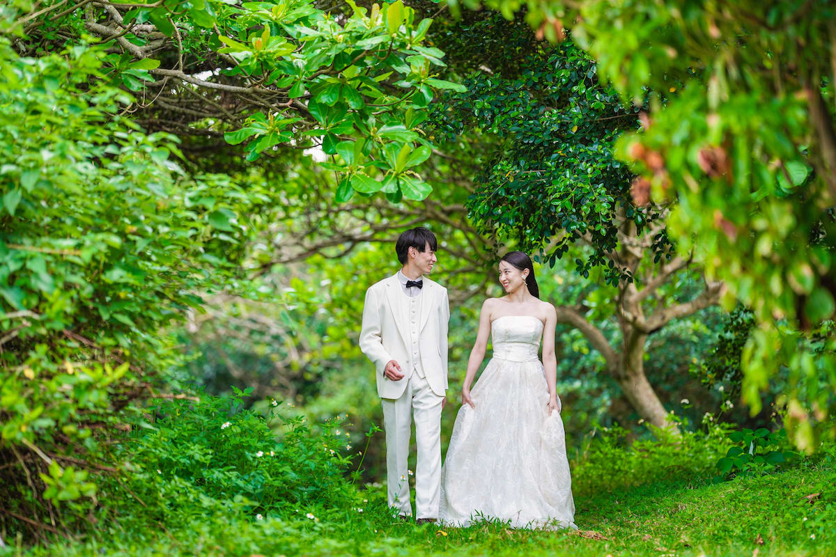 エメラルドグリーンの海と白い砂浜、青い空の下で撮るビーチフォト。沖縄らしい緑の中や文化を感じられるスポットでの撮影も叶います。
