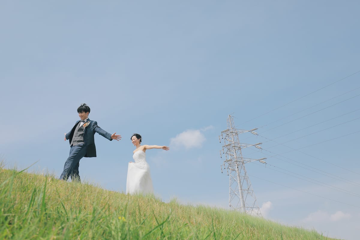 海はもちろん、ひまわり畑や、晴れ渡った青空の下で撮るウェディングフォト。暑さ対策の帽子やサングラスも魅力的な撮影アイテムに。